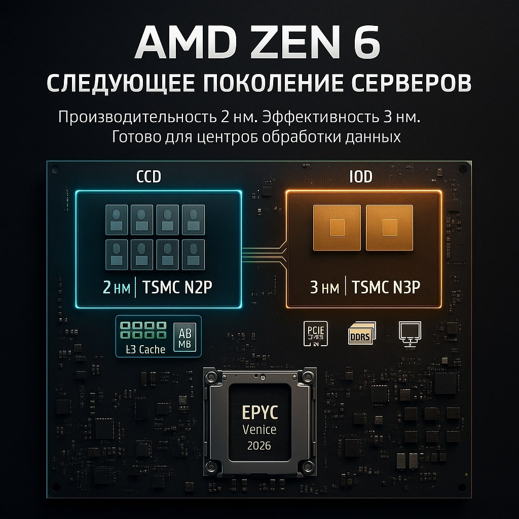 Компания AMD продолжает укреплять свои позиции на рынке высокопроизводительных процессоров, объявив о революционной стратегии для архитектуры Zen 6 — разделении производственных процессов между вычислительными и вводно-выводными кристаллами. Согласно последним утечкам и официальным заявлениям, будущие процессоры AMD Ryzen и EPYC на базе ядер Zen 6 будут использовать два разных техпроцесса TSMC: 2-нм (N2P) для кристаллов вычислительных ядер (CCD) и 3-нм (N3P) для кристаллов ввода-вывода (IOD). Такой подход открывает новые горизонты в производительности, энергоэффективности и масштабируемости как для потребительских, так и для серверных решений.